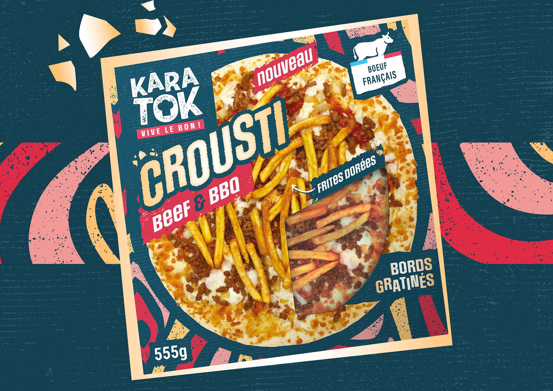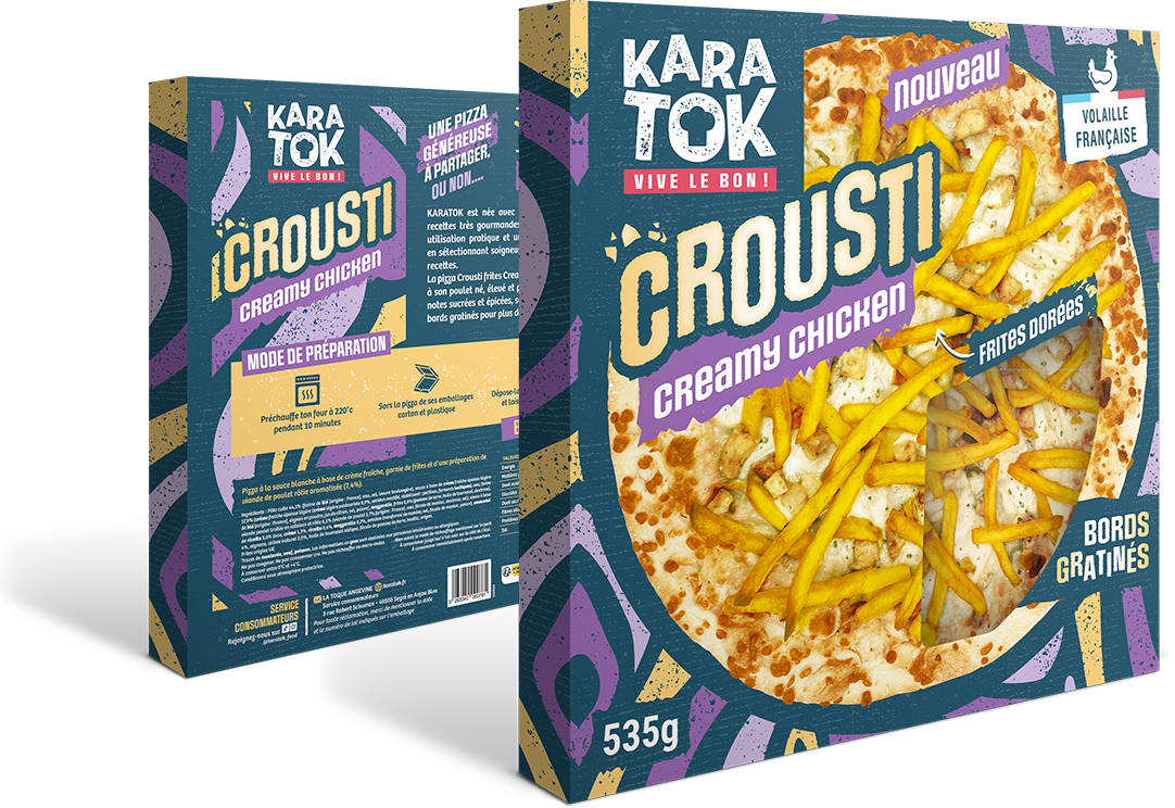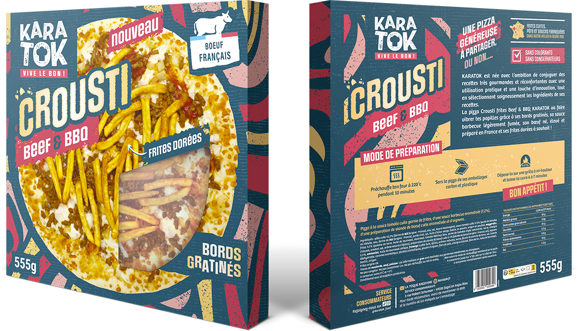 La conception du packaging pour la gamme de pizzas Kara Tok – Vive le Bon ! illustre un travail stratégique visant à concilier impact visuel en rayon et promesse de gourmandise. À travers un design moderne et une hiérarchisation rigoureuse des informations, l'identité visuelle valorise l'originalité des recettes — comme la surprenante version Bœuf & Frites — tout en affirmant un positionnement haut de gamme et appétissant. Chaque élément graphique, du choix chromatique à la mise en scène du produit, a été méticuleusement orchestré pour captiver le consommateur et refléter l’esprit innovant de la marque.